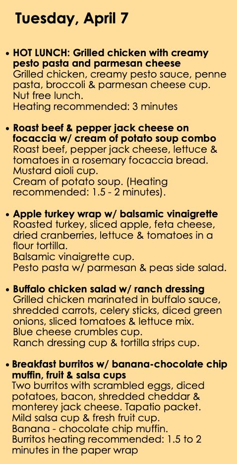 - HOT LUNCH: Grilled chicken with creamy pesto pasta and parmesan cheese